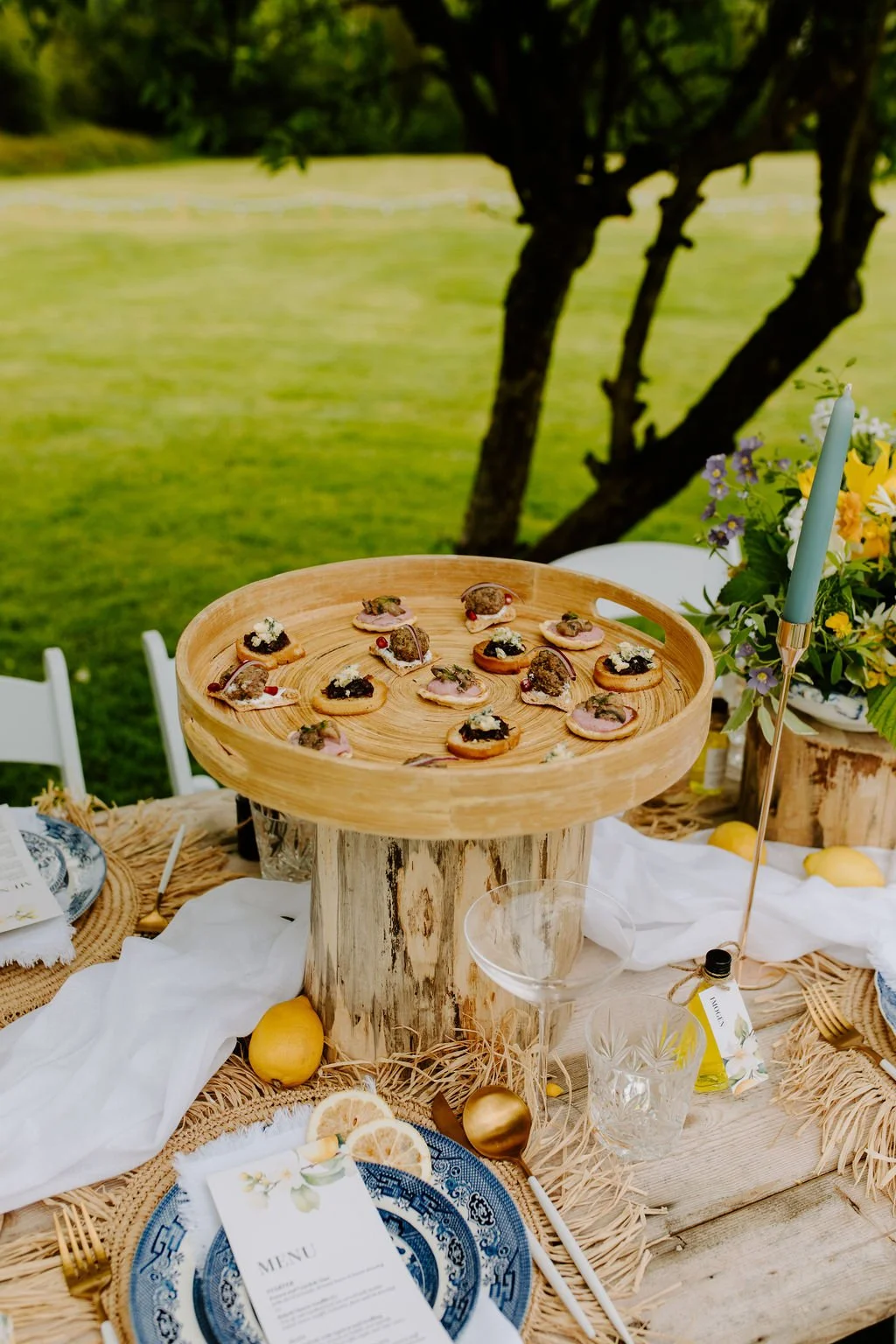 Keeping your guests hydrated is also really important, so my handcrafted Hydration Station made out of rescued and recycled cable drums is the ideal solution. This can be styled however you like, but we chose to match it with our citrus theme and filled the drinks dispensers with traditional lemonade and lime infused water. Adding the cute little drink signs designed by Pretty Creative Stationery into my gold frames and the ‘Hydration Station’ sign into my slotted log chunk, it made a beautiful display for guests to grab a drink from. Finished off with freshly cut lemons and a blue and white plate to match the table, it made the perfect finishing touch.